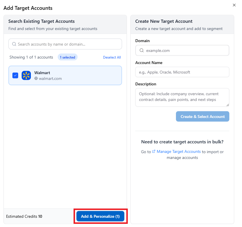 - The newly created account now appears in the left panel of the Add Target Accounts pop-up and is preselected by default. The Add & Personalize button displays the number of accounts selected, along with the estimated credits that will be deducted from the total available credits. Click Add & Personalize to proceed.