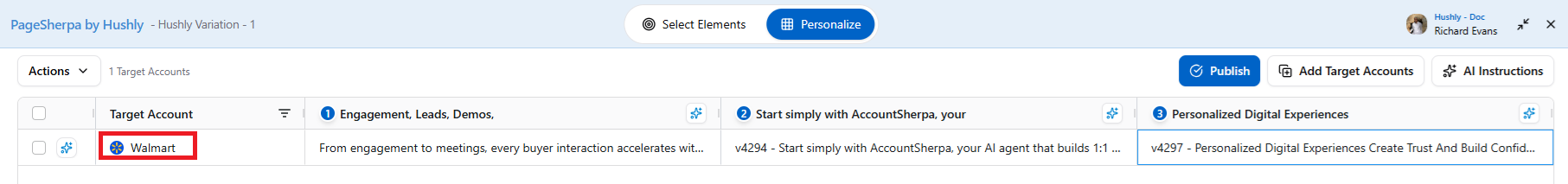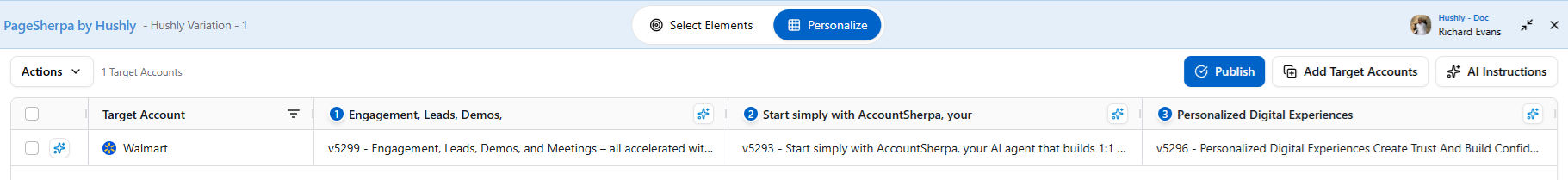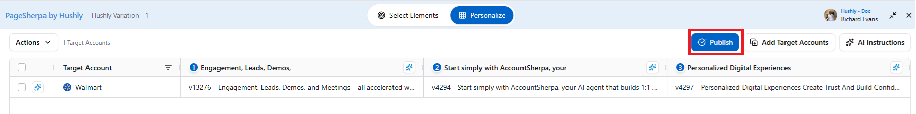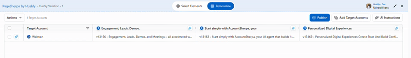 - To preview the variation before publishing, click on the eye icon for the Targeted Account.