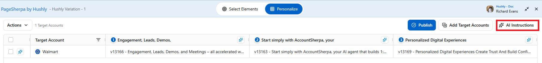 - The Personalize section is displayed with the Personalize tab selected, and the Publish, AI Instructions, and Add Target Accounts buttons are visible. Click the Add Target Accounts.