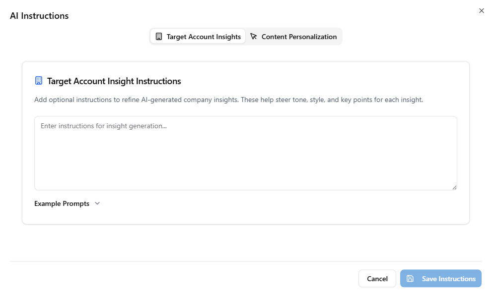 Before adding Target Accounts, go to the AI Instructions, in the Target Account Insight Instructions and Content Personalization section, and add your desired prompt.