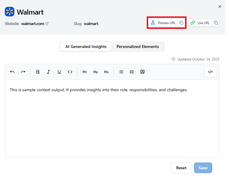 - The Targeted Company page is displayed with the two tabs: AI Generated Insights and Personalized Elements, with the Preview URL and the Live URL links. In the Company Information section, the Company name and the Website are displayed alongside the list of Personalized Elements for the company. Click Preview URL.