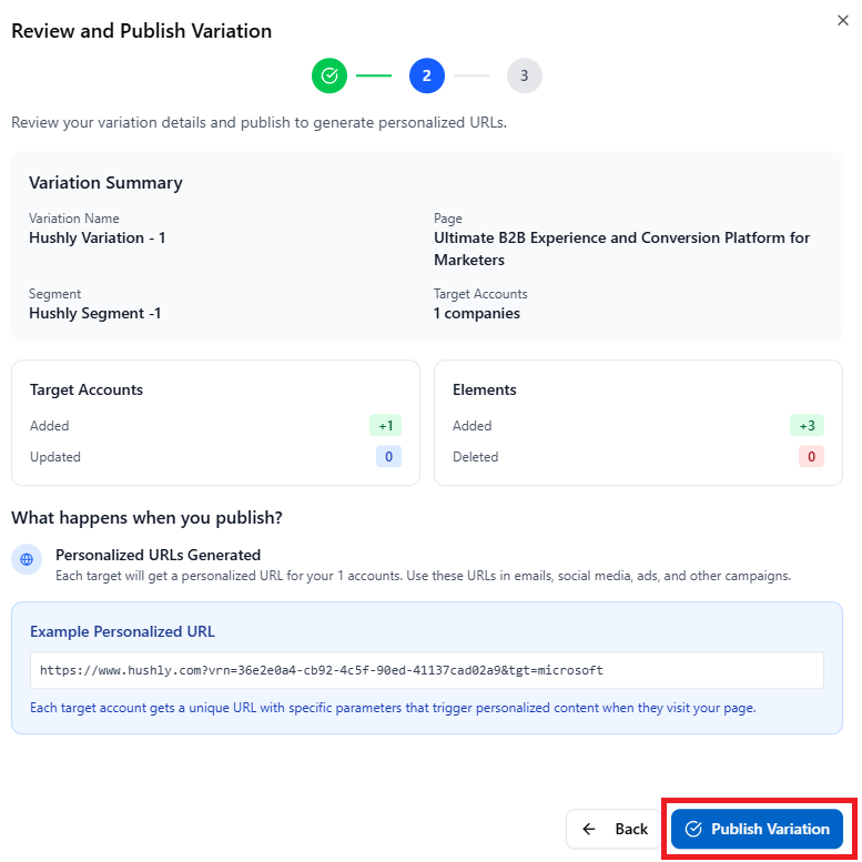 - The Review and Publish Variation section displays a summary of the variation, including the Variation Name, Segment Name, Page Title, Targeted Accounts number, and an Example Personalized URL. At the bottom, you will see two options: Back and Publish Variation. Click Publish Variation to proceed.