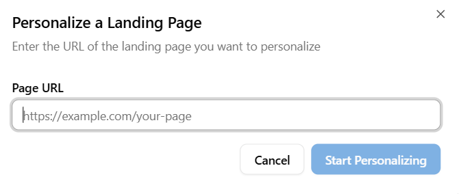- The Personalize a Landing Page pop-up appears, prompting you to enter the page URL you want to personalize. As soon as you begin typing the URL, the Start Personalizing button becomes active. Click Start Personalizing.
