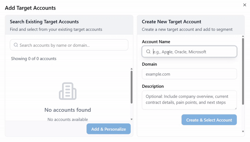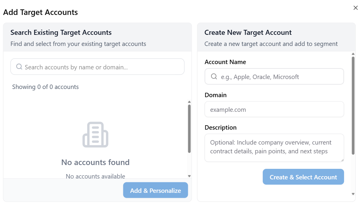 - The Add Target Accounts pop-up window is displayed, showing the fields Account Name, Domain, and Description in the Create New Target Account section on the right-hand side. Along with these fields, the Create & Select Account and Add & Personalize buttons are disabled.
