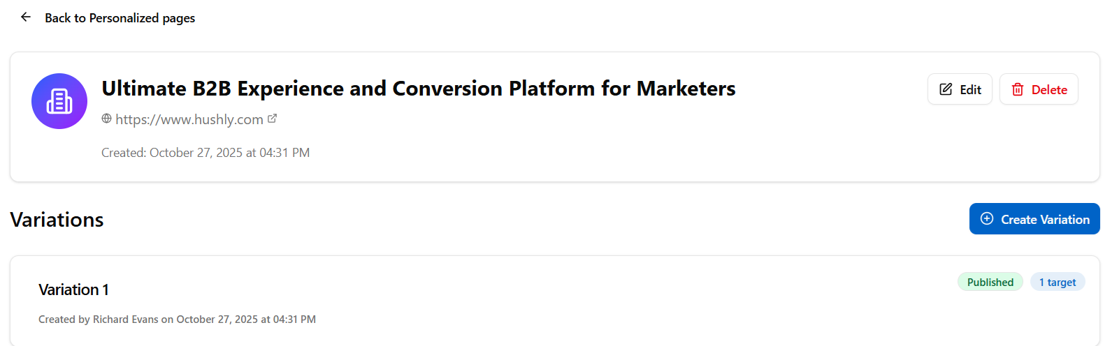 - The Personalized Page displays the Page Title, Edit, and Delete buttons. In the Variation section, the variation appears with a Published status. The Create Variation button is available if you wish to personalize additional elements on the page.