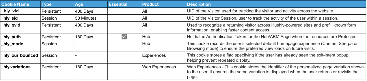 This document describes each cookie, including its type, lifespan, purpose, and relevance to specific Hushly features.