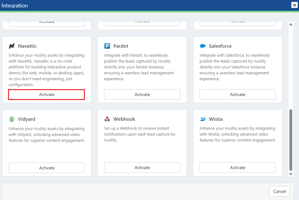 - Once the Navattic Integration steps are complete, you can proceed to set up a Navattic video asset within the Hushly platform. To know more about Setting Up a Navattic Video Asset, click here.