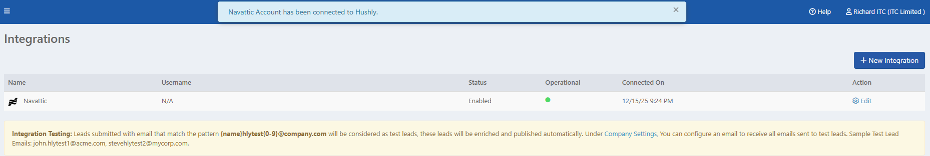 - Navattic is successfully connected to Hushly, and a confirmation message is displayed. A green Indicator is displayed under "Operational," confirming that the connection is active.