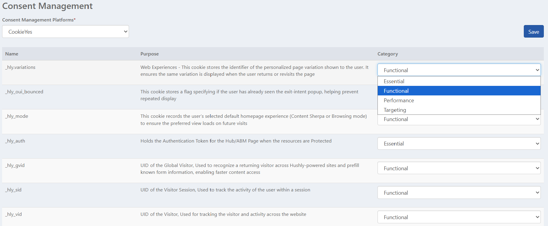 - Selecting Cookiebot as your Consent Management Platform, this would display a list of Hushly cookies along with their purpose and consent category, which is set to Functional by default. You can update the category using the drop-down as needed and click Save.