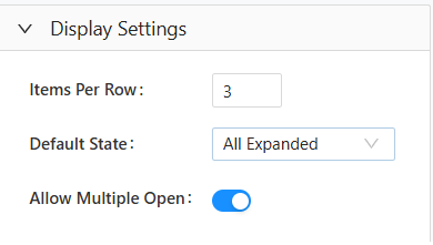 - Display Settings: These control how the FAQ block appears and behaves on the page. These options allow you to customize the layout and interactions of the FAQs, including how many items are shown per row, their default open or collapsed state, and whether multiple items can be expanded at once, ensuring an optimal viewing experience for your audience.