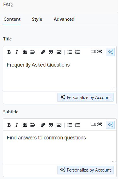 - The FAQ Page Block includes Content, Style, and Advanced tabs. Under the Content Tab, the following sections are displayed: Title, Subtitle, Display Settings, Icon Settings, FAQ Items, and CTA. In the Content section, you can make modifications.
