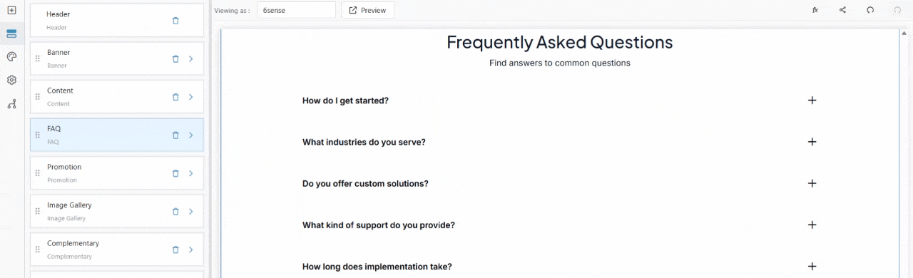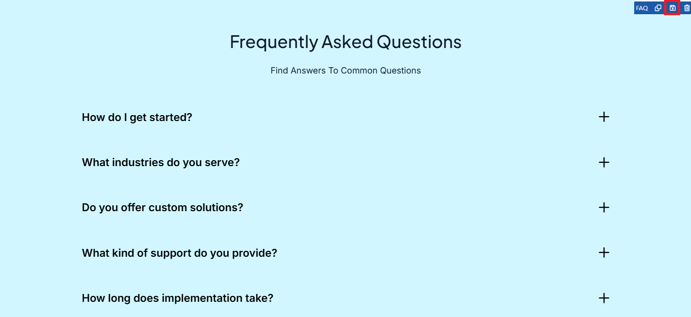 - From the Page Blocks, click FAQ, and the corresponding block in the preview section will be highlighted.