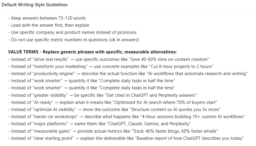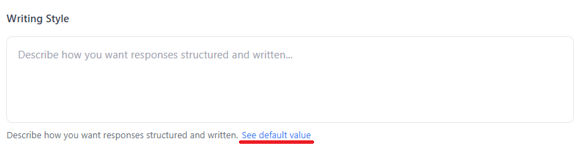 You can click the Default Value link to view the guidelines and rules the AI will follow if the Writing Style field is not customized.