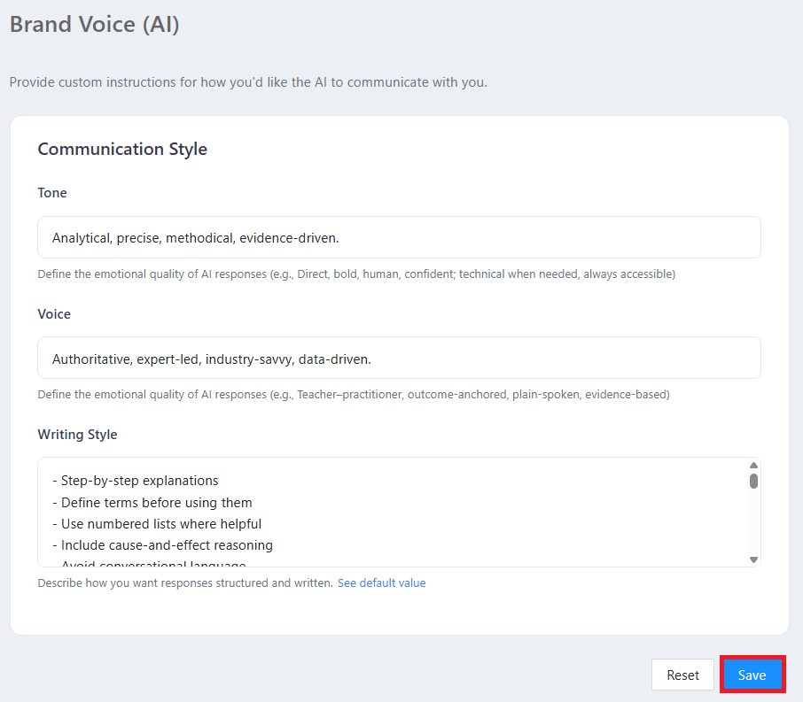 Once the Communication Styles fields (Tone, Voice, and Writing Style) are configured, click Save.