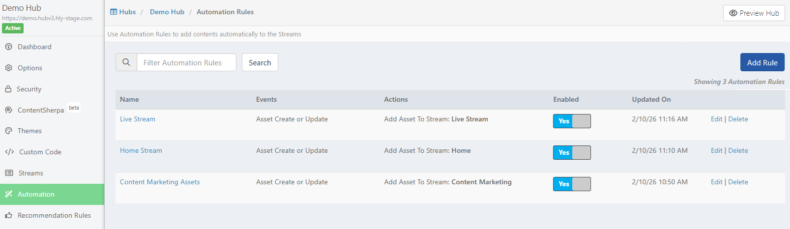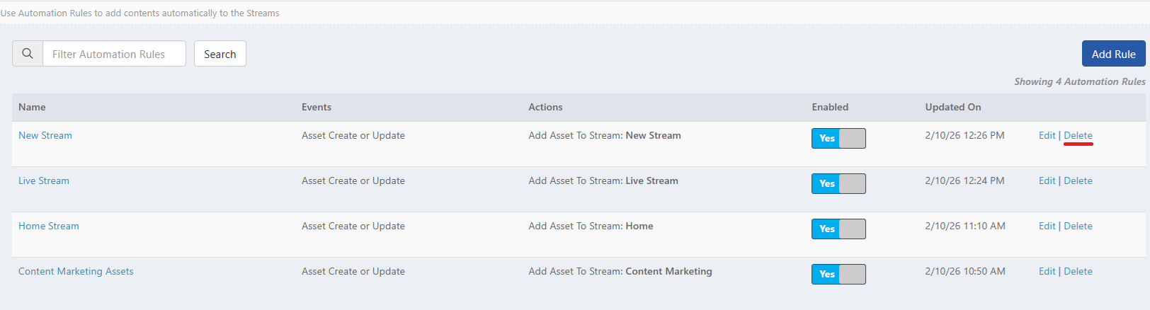 - Select the Automatin Rule from the listing page and click the Delete link.