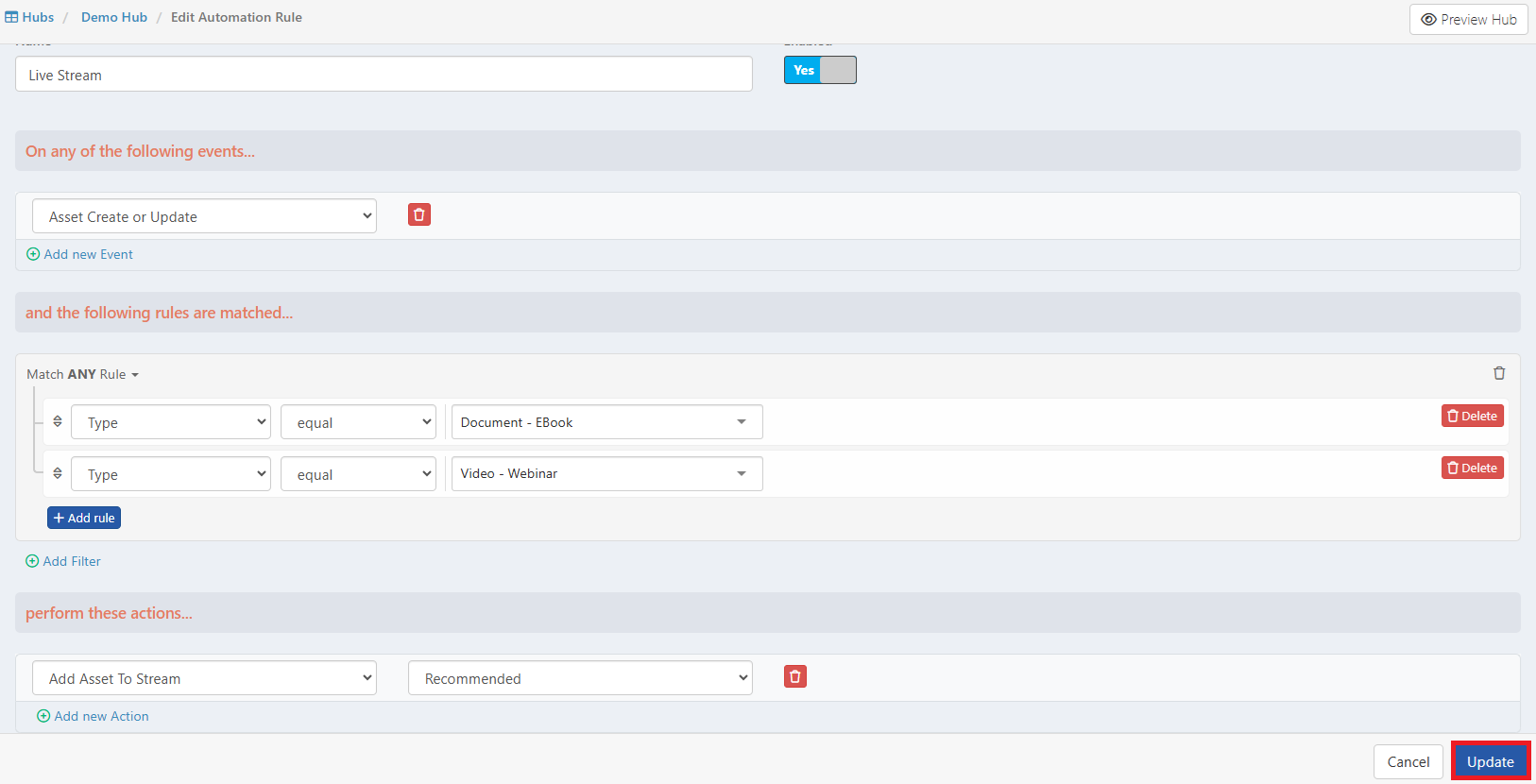 - The Automation Rule edit page is displayed. Make necessary changes and click the Update button.