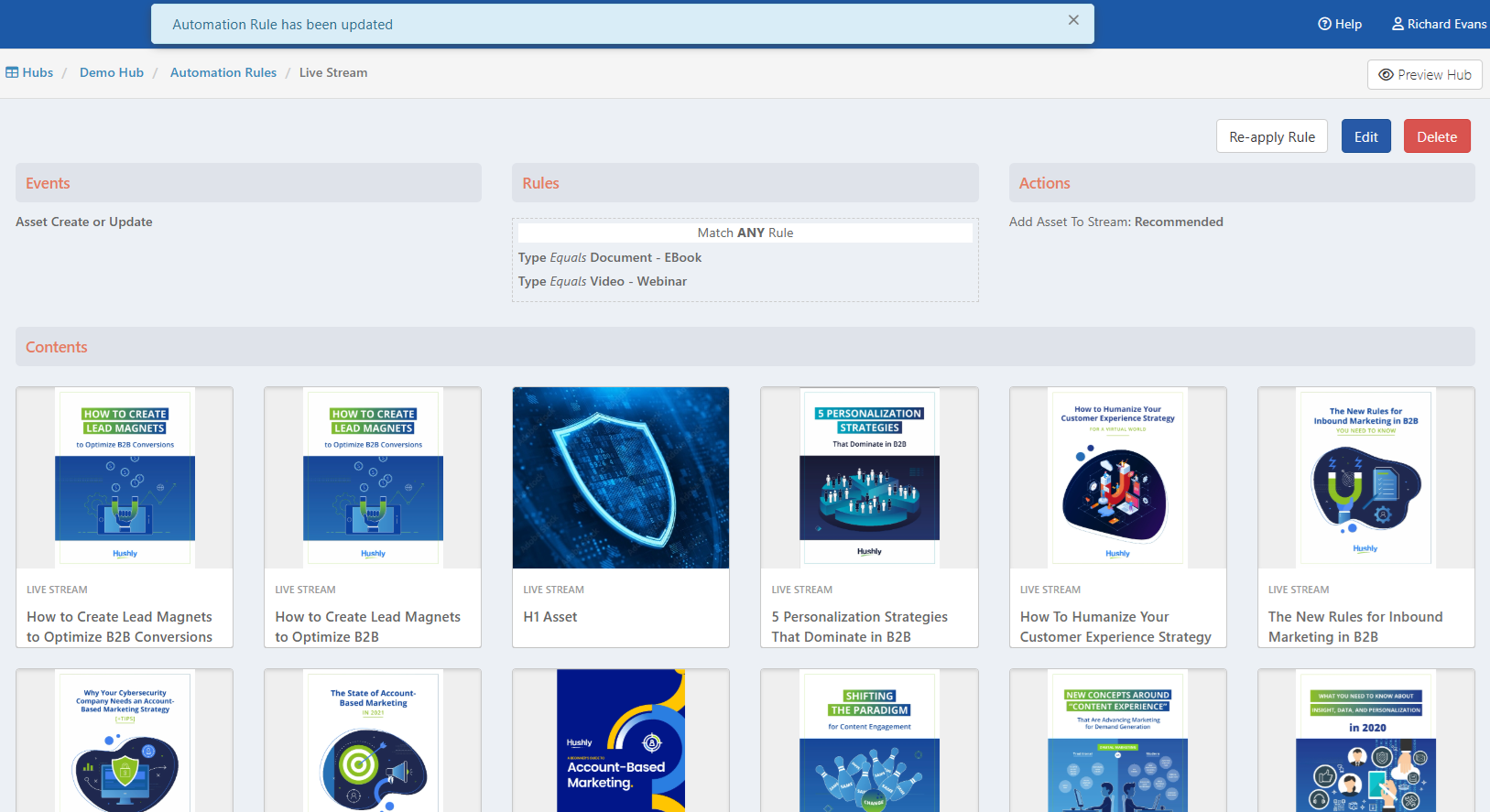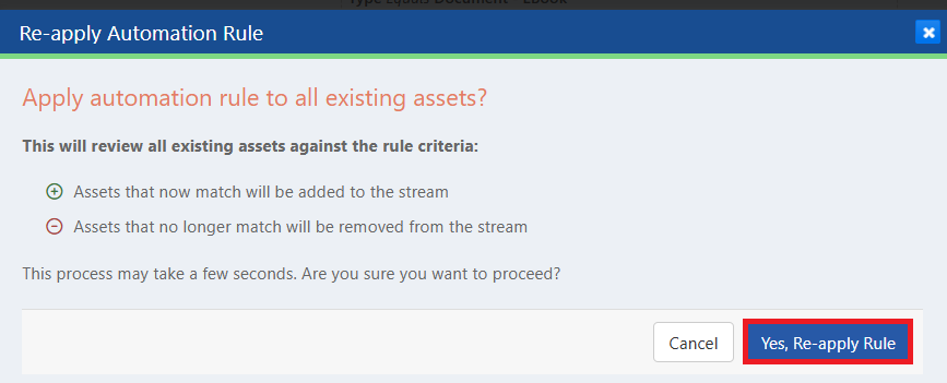 - The Re-Apply Automation Rule confirmation dialog is displayed with Cancel and Yes, Re-apply Rule buttons. Clicking the Yes, Re-apply Rule button adds assets that now match the rule to the stream and removes assets that no longer match the rule from the stream.