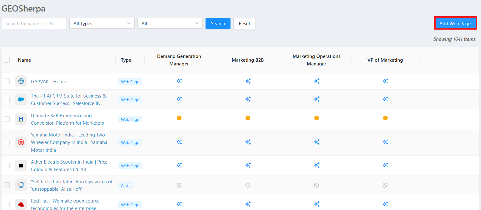 Once added, the web page appears in the listing with its type marked as Web Page and becomes available for AI processing. GEOSherpa analyzes the content and enables question generation across selected personas and journey stages. This helps teams identify content relevance, uncover gaps, and ensure the web page supports targeted audience engagement.
