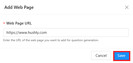 The Add Web Page dialog box displays a field to enter the Web Page URL, along with Cancel and Save buttons. Enter the website URL and click Save to add the web page.