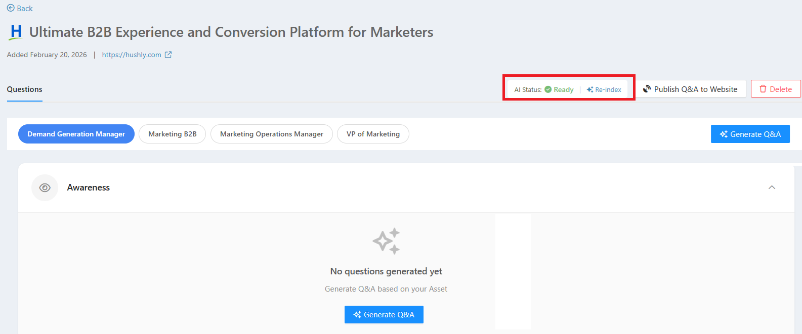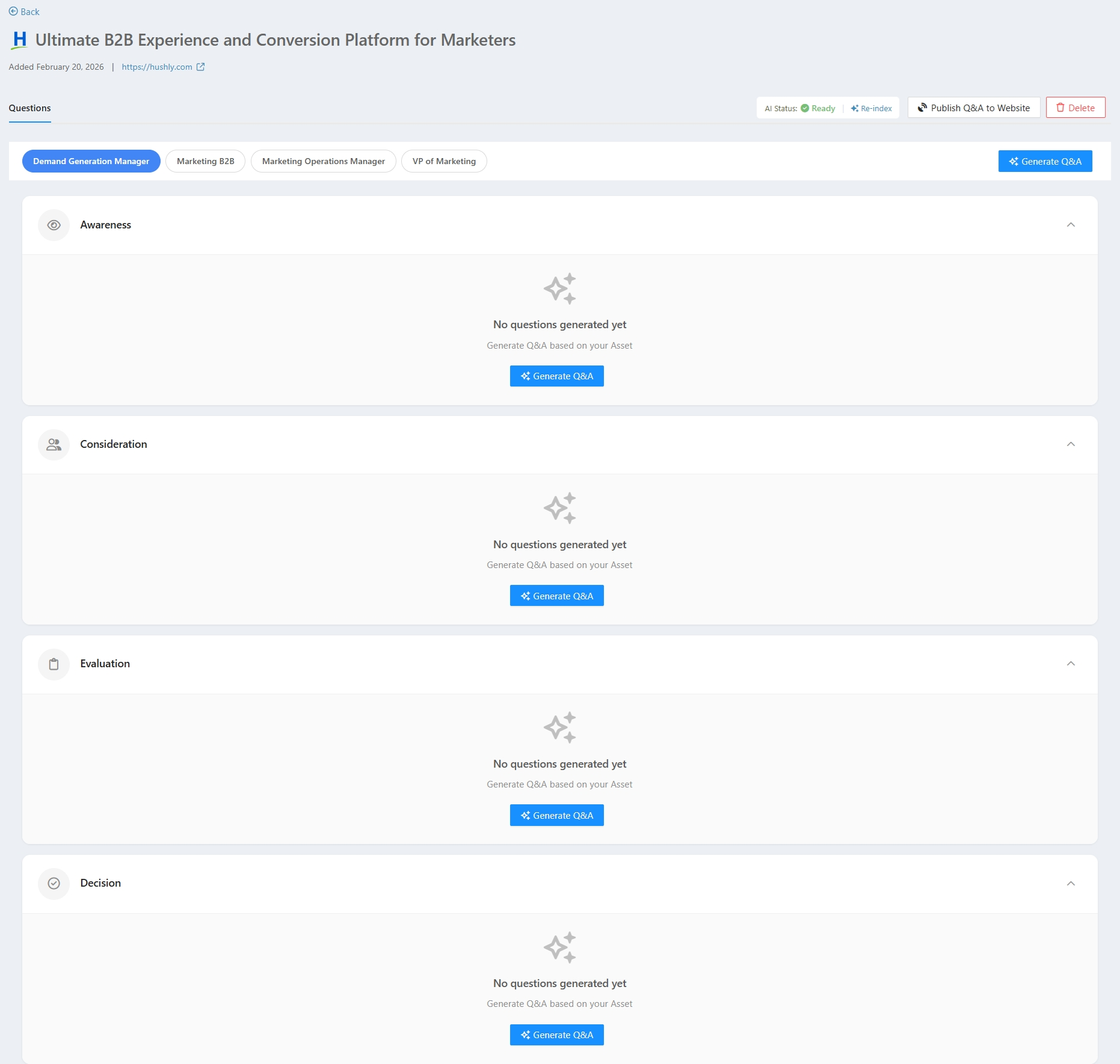 The Questions tab displays the Q&A workspace for an asset, organized by buyer journey stages: Awareness, Consideration, Evaluation, and Decision. You can select Personas to tailor questions to specific audiences. If no Q&A exists, you can use Generate Q&A to create AI-driven questions and answers based on the asset content and selected Personas. This helps deliver relevant, stage-specific FAQs across the buyer journey.