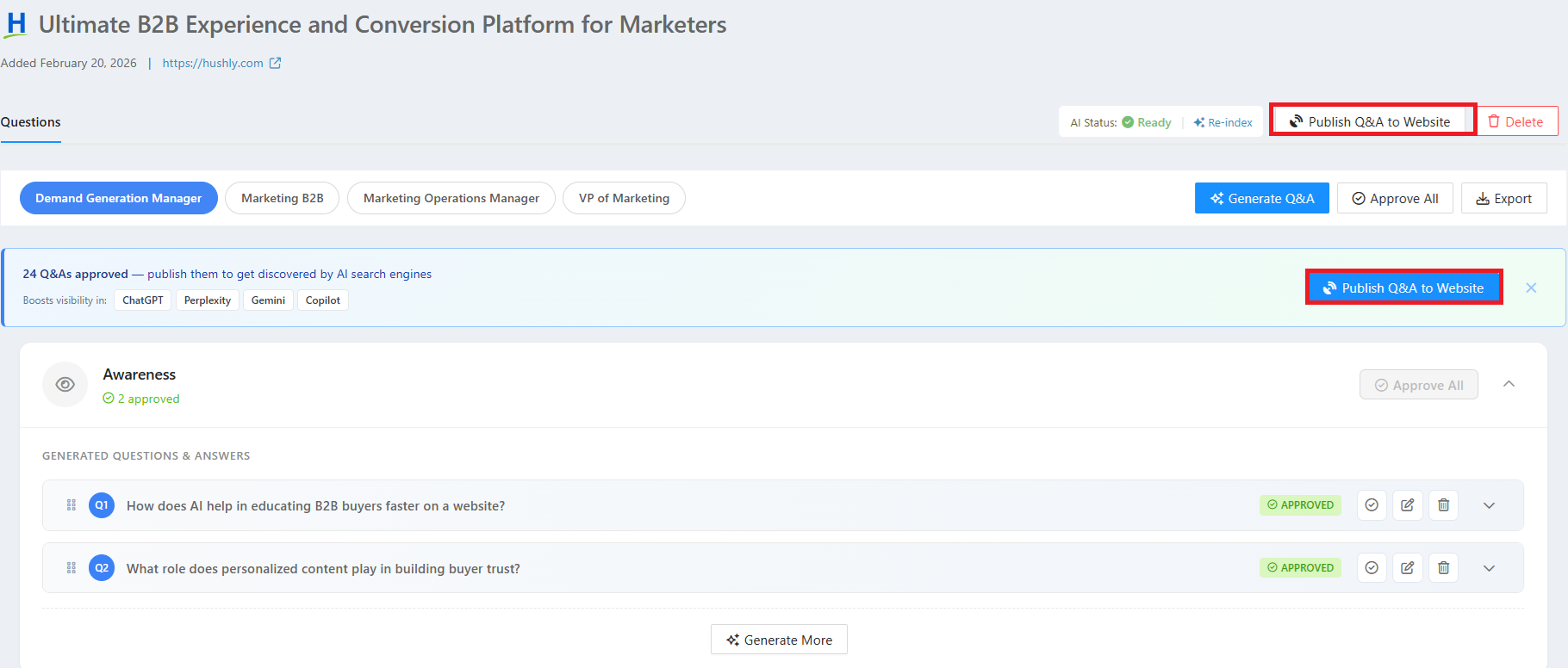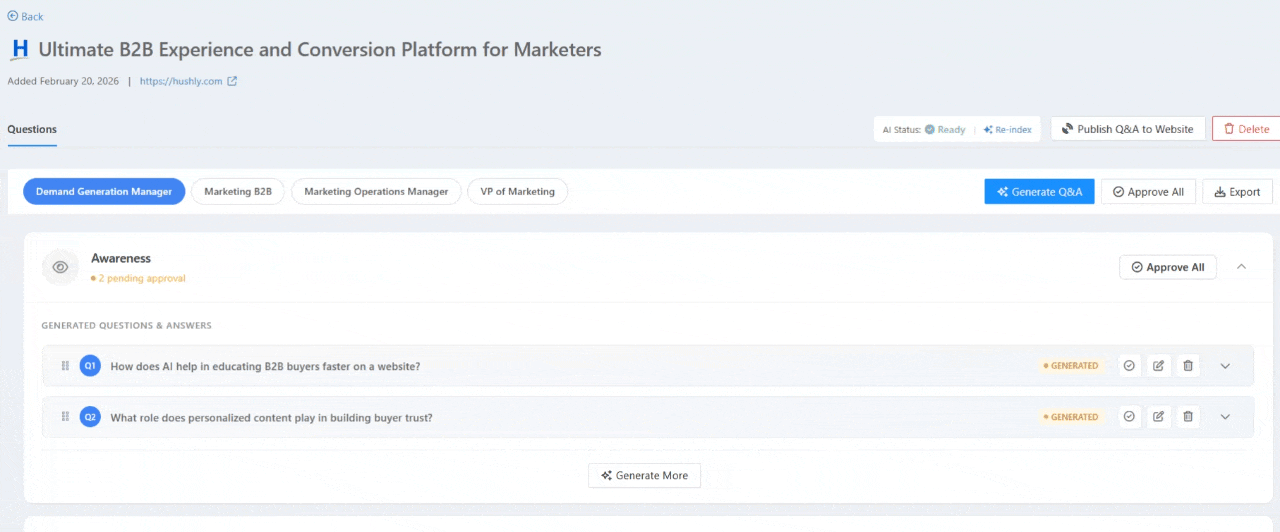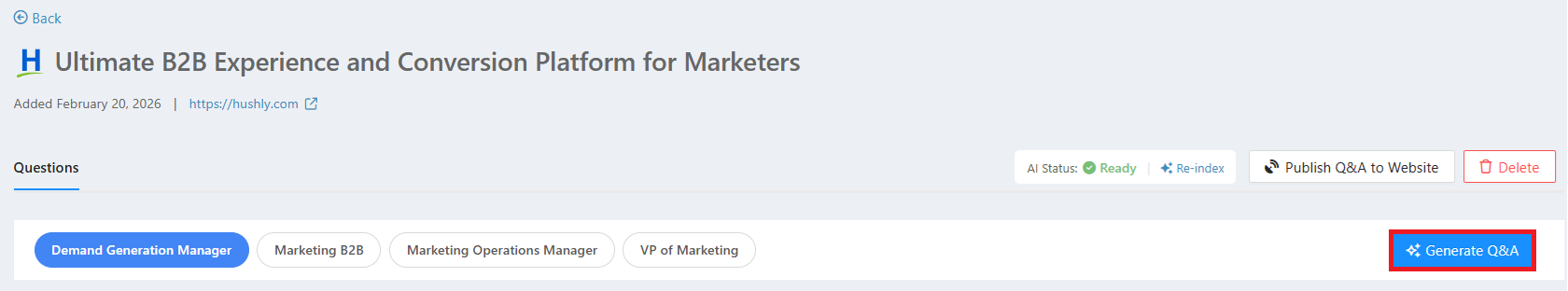 Select the Generate for all Personas option: Automatically generates questions and answers for every defined persona, covering all applicable buying stages.