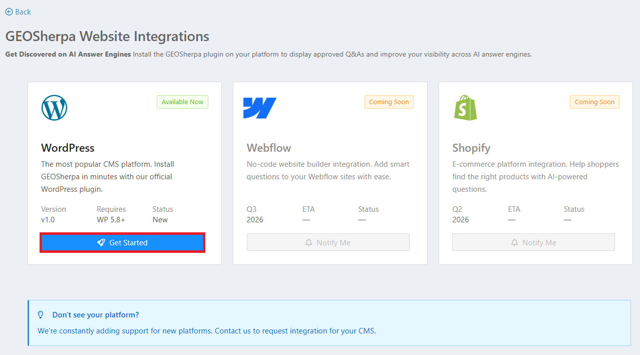The GEOSherpa Website Integrations page is displayed. Click the Get Started button to integrate with WordPress. If your integration is not listed on the Integrations page, please contact your CSM for assistance.
