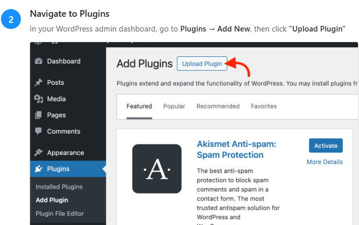 2. Log in to your WordPress Admin Dashboard. Go to Plugins → Add New, then click Upload Plugin.